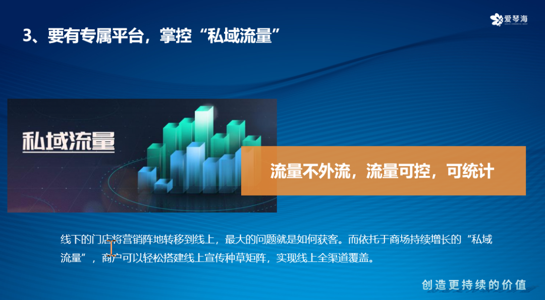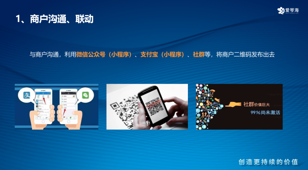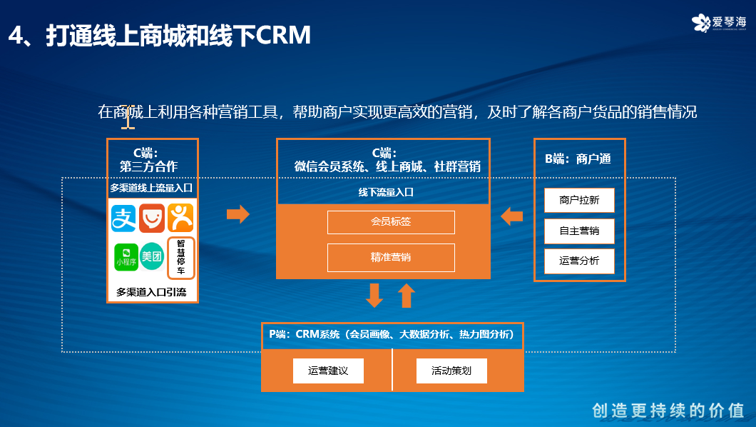 爱琴海还与外围的支付宝、美团、口碑、微信等等的合作,通过他们的流量导入,引入到我们的商场里面,从而可以做新一轮的数据积累。