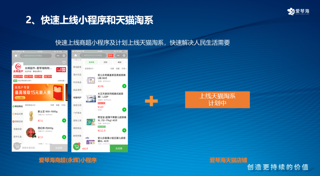 爱琴海快速响应商户需求帮他们构建了数字化生态。例如我们用两天时间就帮助海宁项目的永辉超市上线了小程序,使该项目的社区服务范围快速从1个社区扩大到覆盖周边25个社区的规模。且我们提供免费送货服务,这在当时的特殊时期下,让人们的基础生活等到了最基础的保障,同时也获得了当地政府的首肯。