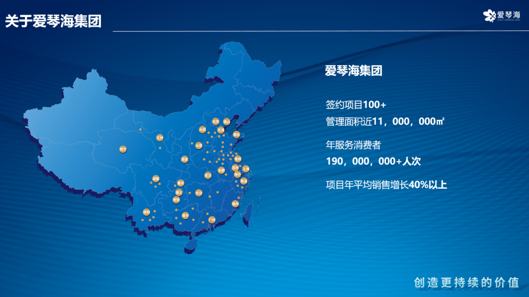 目前,爱琴海已开业运营的项目超过20座。截至到目前,爱琴海签约项目超过100座,覆盖北京、天津、重庆、昆明等核心城市,管理的商业面积规模近1100万平方米,每年服务的消费者共计1.9亿人次,且项目年平均销售额增长达40%以上。