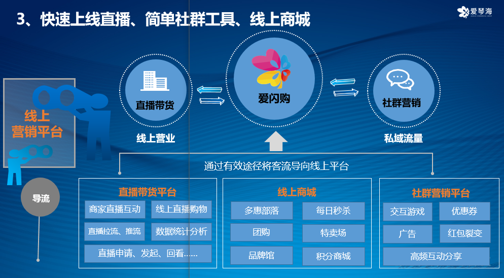 以爱琴海的“爱闪购”为例,它首先是社群营销,将流量以此带入;同时,在这个营销过程中我们又积累了很多社群,在通过社群将流量引导到“爱闪购”平台。看疫情以来的直播带货,我们把流量导入到我们自己的直播平台,再导入爱闪购平台。在爱闪购方面更注重的是趣味性,而并不仅仅是一个线上商城,还有秒杀等等活动吸引顾客。我们也非常注重的社群营销,社群中设置了聊天机器人管控,我们还植入了小游戏及裂变功能等等。