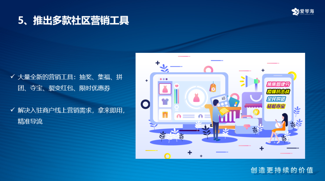 接下来,爱琴海上线了私域流量运营工具,在精准营销、线上线下都作了一些尝试,最终实现了2020年2-3月份的“爱闪购”程序上线。