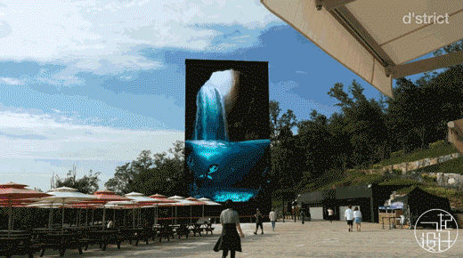 除了上面的巨幕海浪,D'Strict 还创造过许多令人惊艳的三维动态视频墙,这个项目位于韩国轮胎公司 Nexen 的研发办公楼的底部大堂,这个 30m 宽,7m 高的 LED 媒体墙就在大堂入口处,想不注意到都不行。海浪效果在这里同样吸睛,访客从这里进入大厅内部,感官收到直观而又强烈的刺激。